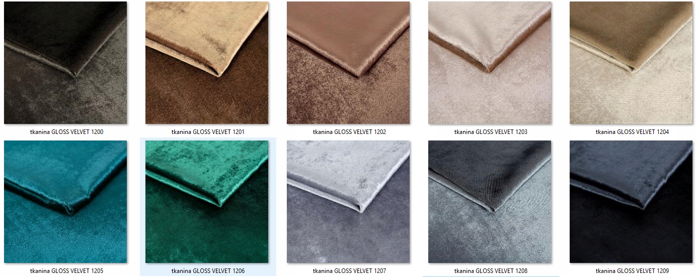 Gloss Velvet posiada bogatą kolorystykę. Jest materiałem tapicerskim miłym i delikatnym w dotyku. Należy do grupy tkanin typu velvet, o właściwościach antybakteryjnych i trudnopalnych. Tkaniny Gloss Velvet są odporne na mechacenie i na działanie światła – nie płowieją. Zostały wyprodukowane w najnowszej technologii, która jest przyjazna dla środowiska i zdrowia człowieka.